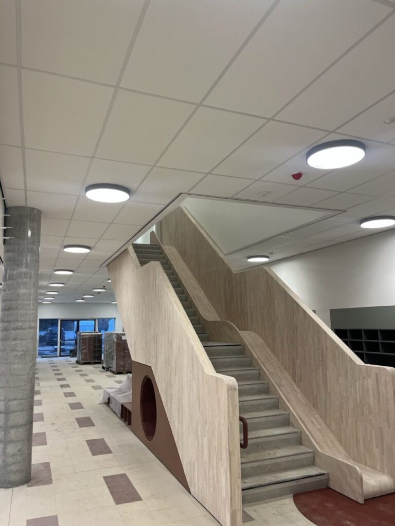 In een levendige schoolomgeving waar kinderen leren, spelen en ontdekken, is akoestisch comfort van groot belang. De circulaire plafondpanelen van Circq zorgen hier voor de nodige rust, terwijl ze tegelijk bijdragen aan een prettige uitstraling van de ruimtes.